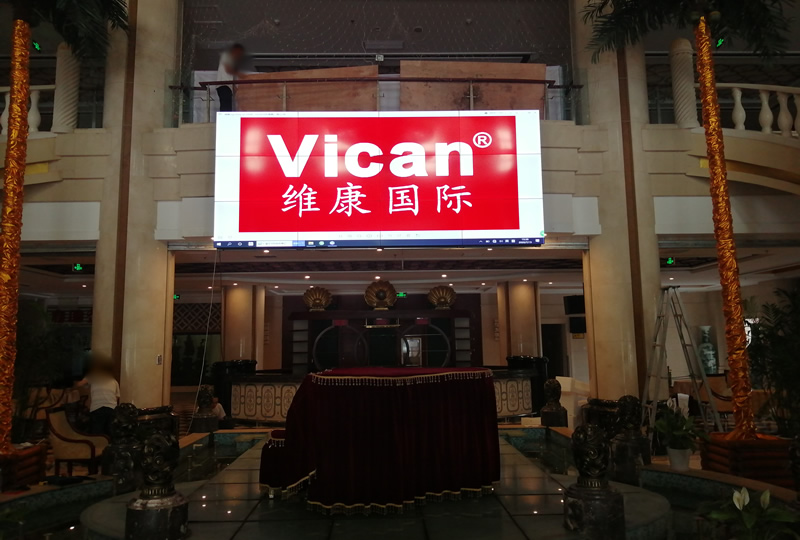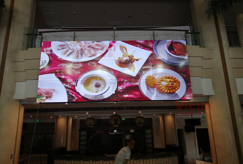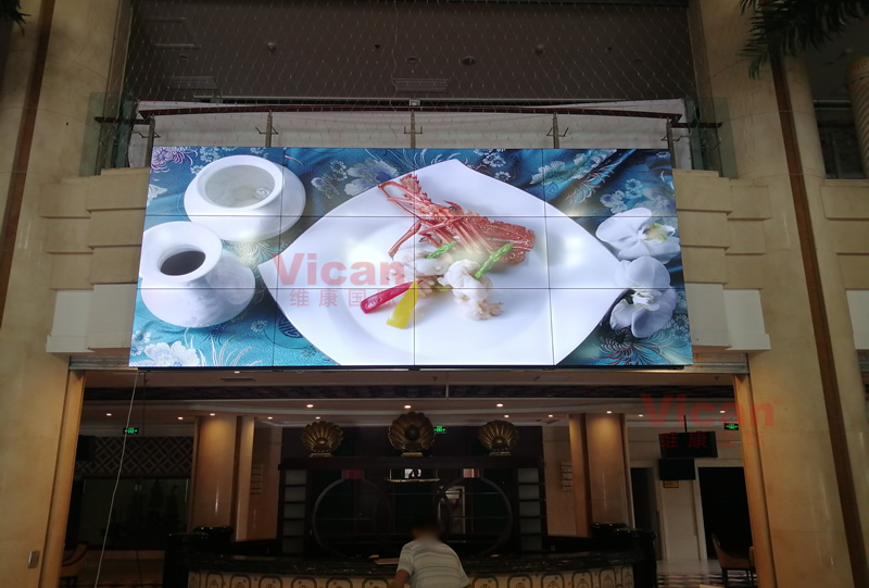 這套大屏采用3行4列的55寸0.88mm液晶拼接屏,超窄邊設計,畫面清晰亮麗,有著很好的一體化顯示效果,主要用來宣傳酒店特色、信息公告等內容。
