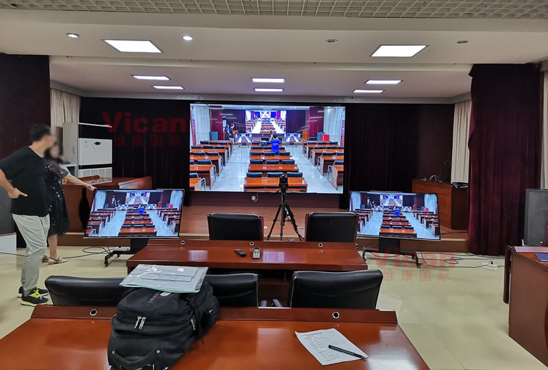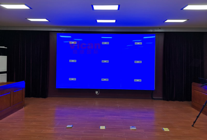 這套會(huì)議大屏由3行3列、55寸液晶拼接屏組成,超窄邊設(shè)計(jì),有著很好的一體化顯示效果,主要用來視頻會(huì)議、會(huì)議信息顯示使用。