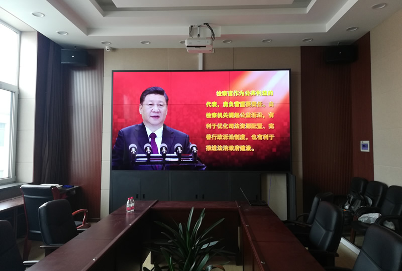 該案例中,維康國際為遼寧沈陽某檢察院提供一套會議大屏,采用3行3列,機柜式安裝安裝的55寸液晶拼接屏,超窄邊設(shè)計,雙邊物理拼縫僅有0.88mm,有著很好的大屏畫面一體化顯示效果。