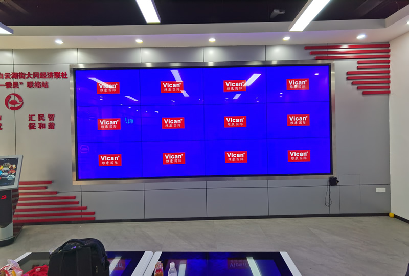本案例中,是維康國(guó)際為廣州大崗村委提供的一套觸摸顯示屏,由3行4列、55寸液晶拼接屏,搭配紅外觸摸逛組成,如上圖所示。
