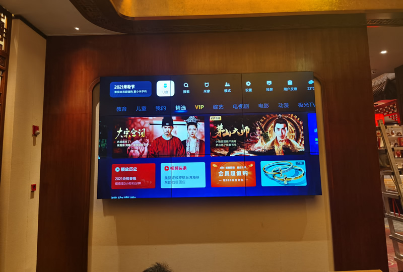 本案例中,維康國(guó)際為深圳羅湖某休閑會(huì)所提供一套顯示大屏,由3x3拼接、55寸液晶拼接屏組成,屏體采用LG超窄邊1.8mm原裝液晶面板,讓大屏幕畫(huà)面顯示更清晰細(xì)膩,拼縫更小,有著很好的一體化顯示效果。