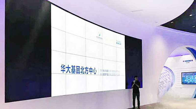 華大基因的展廳采用4x7拼接,55寸3.5mm液晶拼接大屏,用來(lái)展現(xiàn)信息及產(chǎn)品發(fā)布,有著很好的超大尺寸畫(huà)面的視覺(jué)體驗(yàn)。
