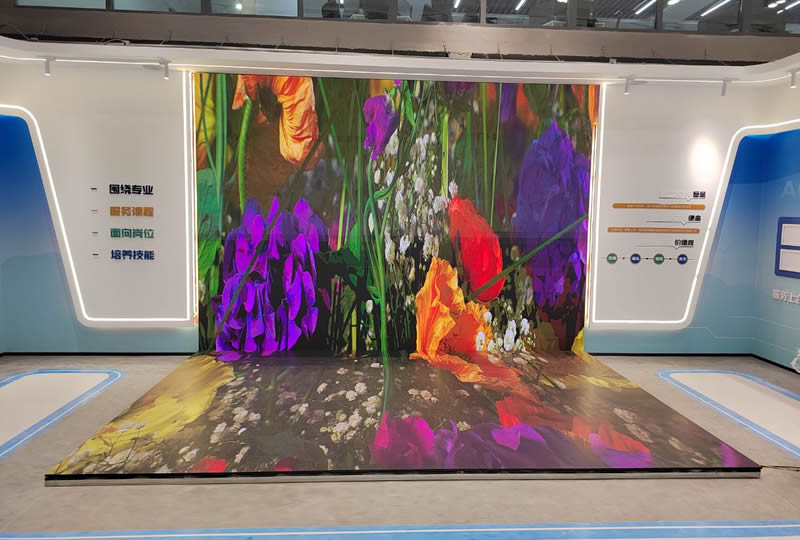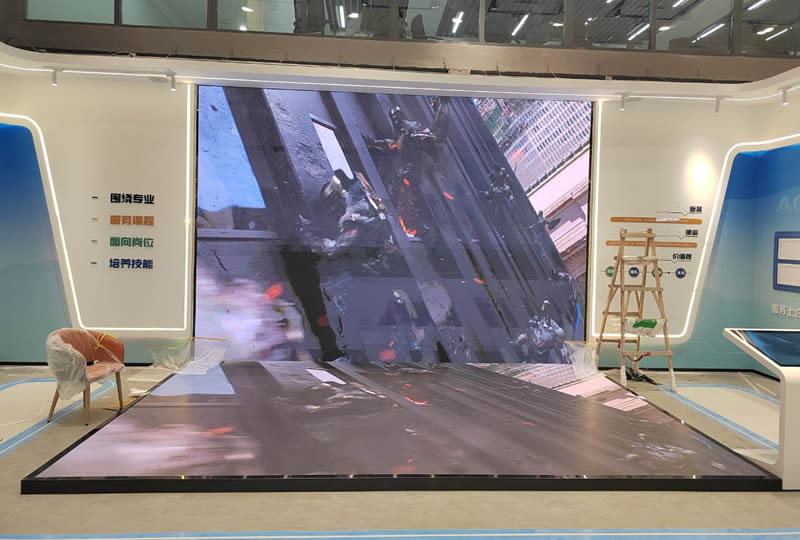 本案例中,維康國(guó)際為青島市某企業(yè)展廳提供一套L型LED顯示屏,如上圖所示,地面與墻面形成90度角,大屏幕顯示清晰,3D圖像顯示效果更好。