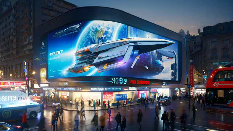 重慶觀音橋商圈的裸眼 3D 屏擁有超高清 LED 巨幕,面積達(dá) 3788 平方米。其播放的內(nèi)容以科幻場(chǎng)景為主,如一艘神秘的大型太空飛船從大樓里緩緩駛出,并圍繞大樓旋轉(zhuǎn)飛行,市民無需任何設(shè)備,僅通過裸眼就能感受到逼真震撼的 3D 視覺效果。當(dāng)太空飛船艙門打開時(shí),屏幕所在的墻體仿佛被掀開一個(gè)洞,讓觀眾產(chǎn)生身臨其境的感覺。后來推出的 2.0 版內(nèi)容,運(yùn)用先進(jìn)的 3D 建模技術(shù),結(jié)合重慶 “輕軌穿樓” 的經(jīng)典場(chǎng)景,進(jìn)行創(chuàng)意解讀,進(jìn)一步增強(qiáng)了內(nèi)容與城市特色的關(guān)聯(lián)性。在技術(shù)實(shí)現(xiàn)上,該屏幕具備高亮度、高對(duì)比度等特點(diǎn),即使在戶外強(qiáng)光環(huán)境下,畫面依然清晰可見,色彩鮮艷。從這個(gè)案例可以看出,深度挖掘城市特色元素,并運(yùn)用先進(jìn)的 3D 建模和顯示技術(shù)將其呈現(xiàn)出來,能夠打造出具有強(qiáng)烈地域特色和吸引力的裸眼 3D 顯示屏;同時(shí),不斷更新和優(yōu)化內(nèi)容,保持新鮮感,也是吸引觀眾持續(xù)關(guān)注的關(guān)鍵。