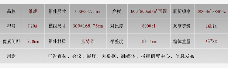 箱體尺寸600*337.5mm,為16:9比例,保證拼接時(shí)圖像不變形。亮度600~800cd/m2可調(diào),對(duì)比度達(dá)8000:1,灰度等級(jí)16bit,色彩更加豐富。