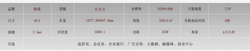 京東方49寸拼接屏目前只有一款3.5mm拼縫規(guī)格,而且是拼接后的寬度,3.5mm也是當(dāng)前拼接屏拼縫規(guī)格中主流的一款,拼縫適中,在各種場(chǎng)合都可以使用。