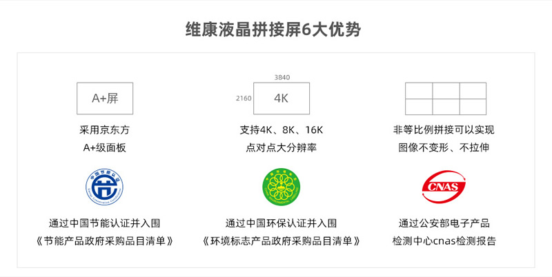維康國(guó)際通過(guò)了ISO9001質(zhì)量管理體系、ISO14001、OHSAS18001、3C、節(jié)能認(rèn)證、環(huán)保認(rèn)證、公安部cnas檢測(cè)報(bào)告、抗震8級(jí)、防塵、CE、CB、FCC、ROHS、外觀專(zhuān)利、大屏軟件專(zhuān)利等,在支持客戶(hù)參與招投標(biāo)項(xiàng)目中有很大優(yōu)勢(shì)。