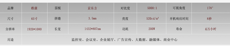 京東方65寸液晶拼接屏長(zhǎng)寬尺寸為1432*807mm,基本參數(shù)如下: