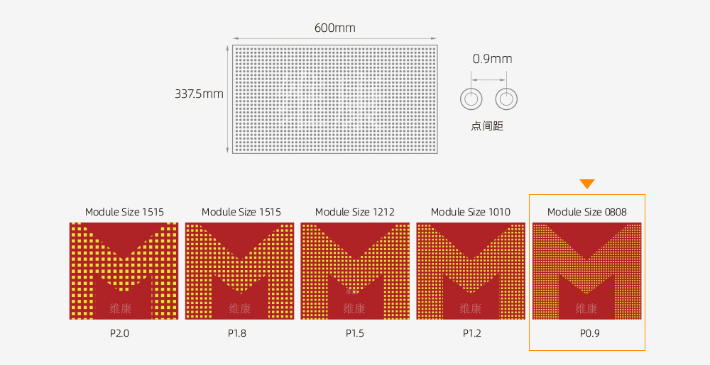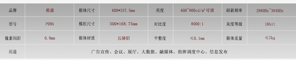 箱體尺寸為600*337.5mm,模組尺寸300*168.75mm,像素間距0.9mm,箱體重量小于6kg,亮度600~800可調,灰度等級16bit,刷新率2880Hz~3840Hz,前維護安裝,8級防震,LED燈壽命大于10萬小時。