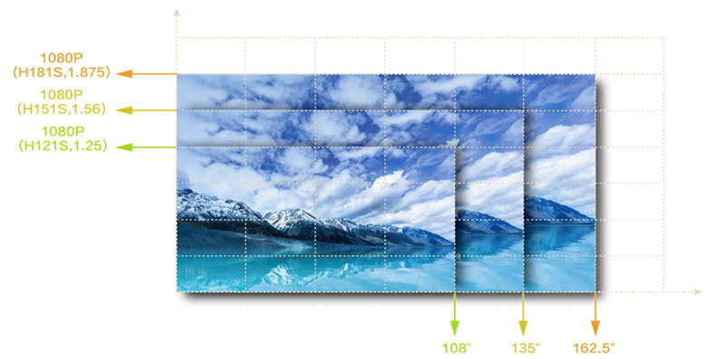 由于箱體是16:9比例,所以在拼接時只要保證等比例數(shù)量的拼接,整個LED顯示屏就不會發(fā)生變形,從而保證整體的顯示效果。如下圖,P1.53小間距LED顯示通過5*5拼接后即可達到一個1080P的分辨率效果。